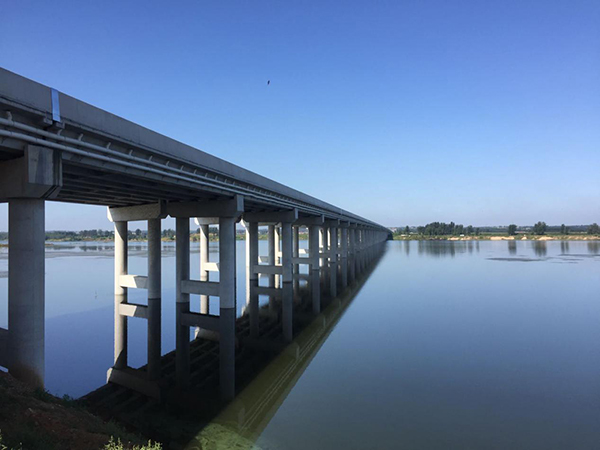 濰河特大橋?yàn)镚309榮蘭線(xiàn)石埠至濰坊段改建工程新建橋梁,中心樁號(hào)K302+737.5。該橋平面位置位于直線(xiàn)段上,跨徑組合52-30m,上部結(jié)構(gòu)采用30米預(yù)應(yīng)力砼小箱梁(先簡(jiǎn)支后連續(xù)),下部結(jié)構(gòu)采用肋板臺(tái)、柱式墩、鉆孔灌注樁基礎(chǔ)。橋全長(zhǎng)1567米,橋?qū)?.5米防撞墻+11.207米行車(chē)道+0.586米新澤西護(hù)欄+11.207米行車(chē)道+0.5米防撞墻,全寬24米。鋪裝層采用10cm瀝青砼+SBS防水層+15cmC50防水砼。橋面鋪裝采用4孔一聯(lián),全橋共13聯(lián),橋臺(tái)采用D80伸縮縫,橋墩伸縮處采用D160伸縮縫。全橋總造價(jià)16528萬(wàn)元,由山東宏昌路橋集團(tuán)有限公司承建。
